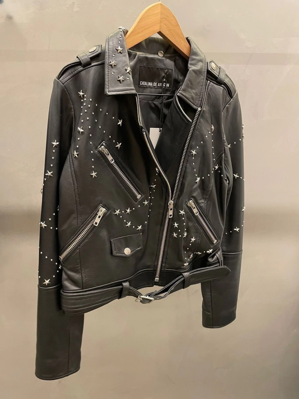 Descubrí la Campera de cuero The Beat, una prenda que combina la calidad del cuero de oveja con un diseño único y llamativo. Su característica más distintiva son las tachas en forma de estrella que, cuidadosamente distribuidas, forman un patrón que realza la personalidad de quien la lleva. Esta campera es el balance perfecto entre rebeldía y sofisticación, ideal para quienes buscan destacar con un estilo auténtico y contemporáneo.
